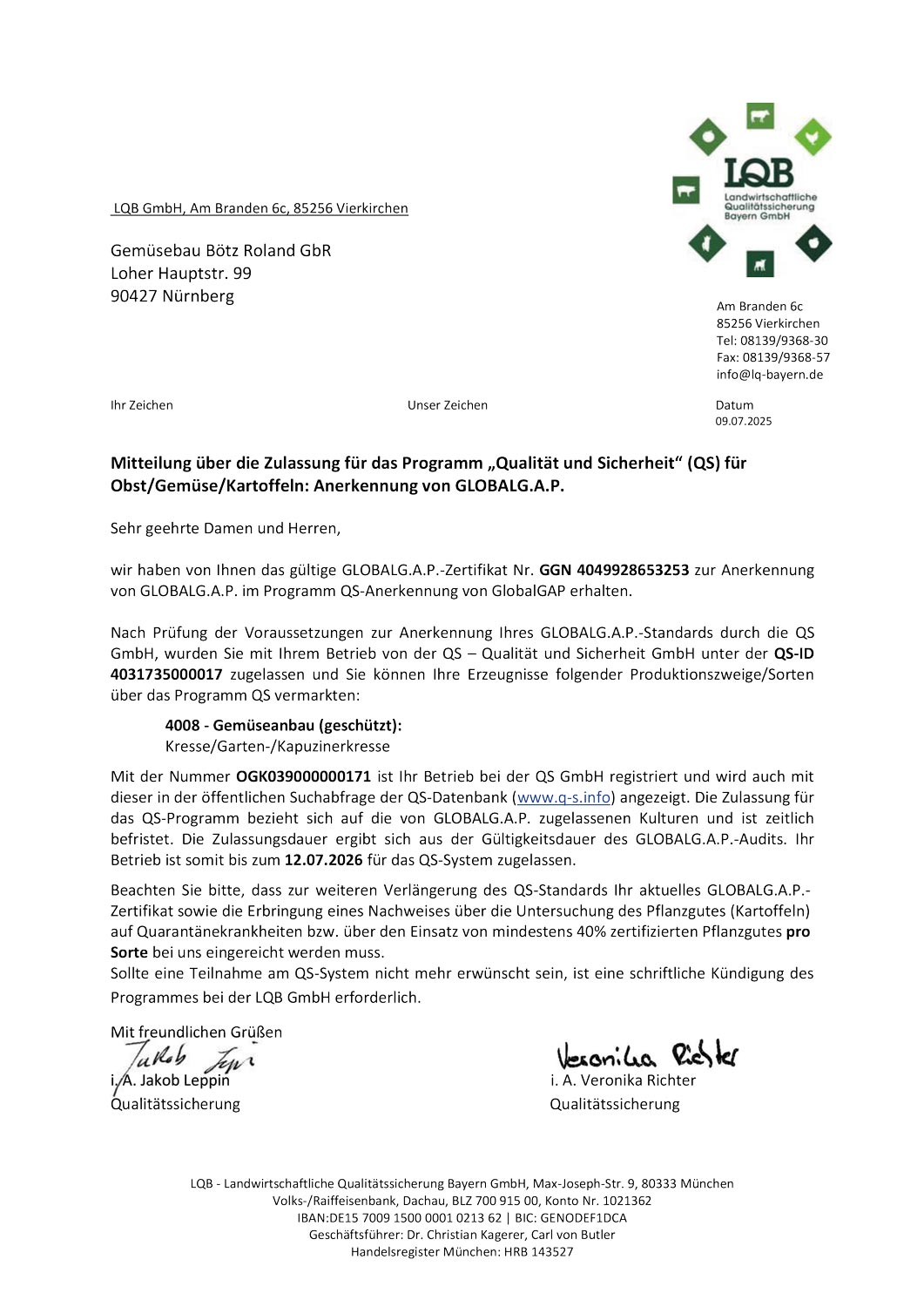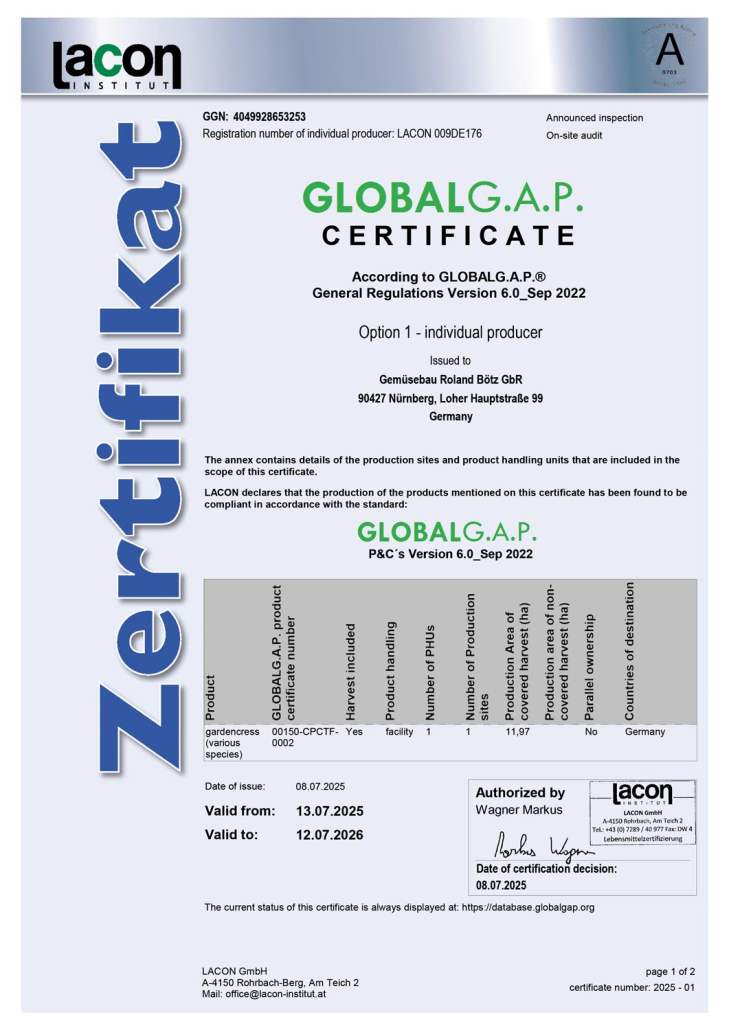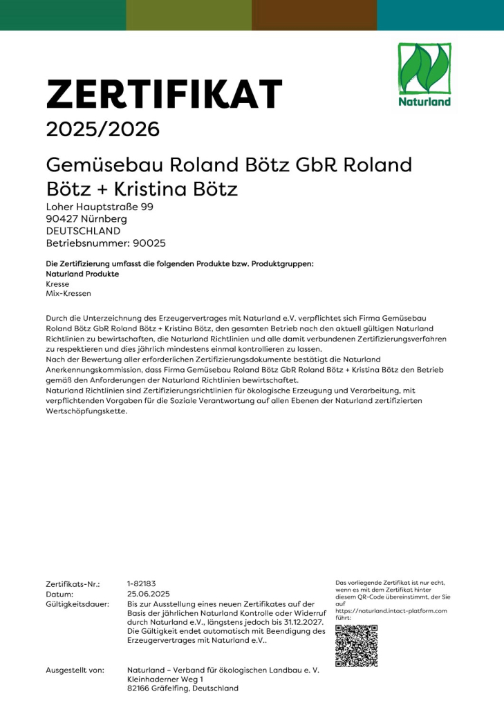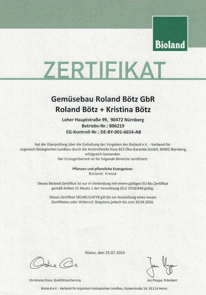 Wir sind ein mittelständischer Familienbetrieb aus Nürnberg inmitten des traditionsreichen Gemüseanbaugebietes Knoblauchsland. Unser Betrieb wird bereits in der vierten Generation bewirtschaftet und ist dabei stetig gewachsen. Seit 1984 haben wir uns auf die Produktion von Kressen spezialisiert. Einige Jahre später entschieden wir uns für den biologischen Anbau und produzieren seitdem nach den Richtlinien der deutschen BIO-Verbände Bioland und Naturland.